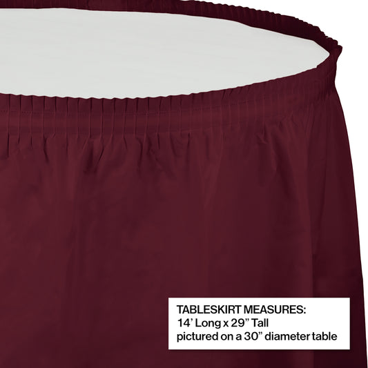 Need to hide event supplies or create a classy backdrop? The disposable plastic table skirts are a wonderful product that is great to use on buffet serving tables, check-in stations for conferences or on temporary stages. The material is easy to wipe clean and the decorative pleated top edge is easy to adhere to table edges to keep the skirt in place. The plastic table skirts create a curtain and supplies can easily be hidden underneath the table.