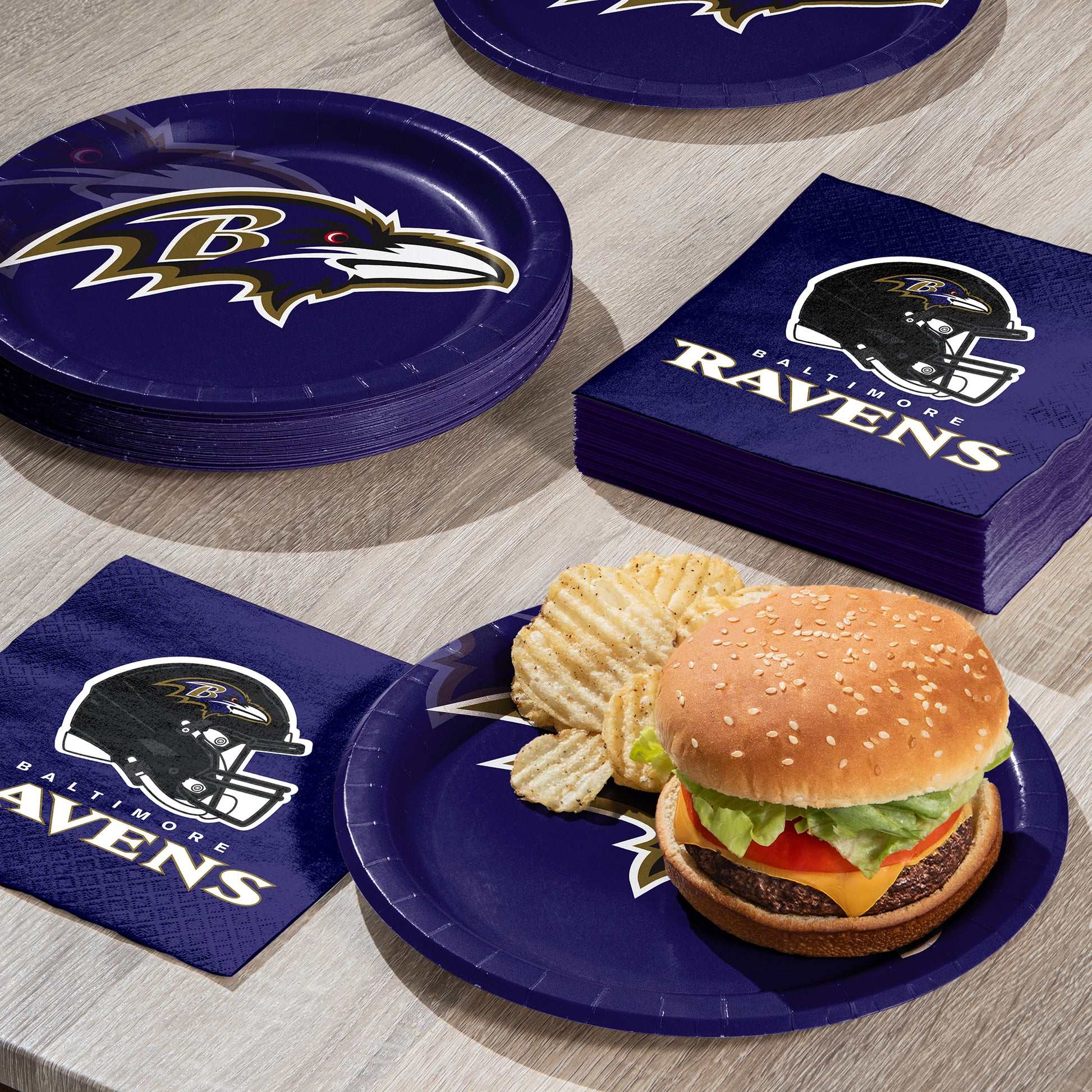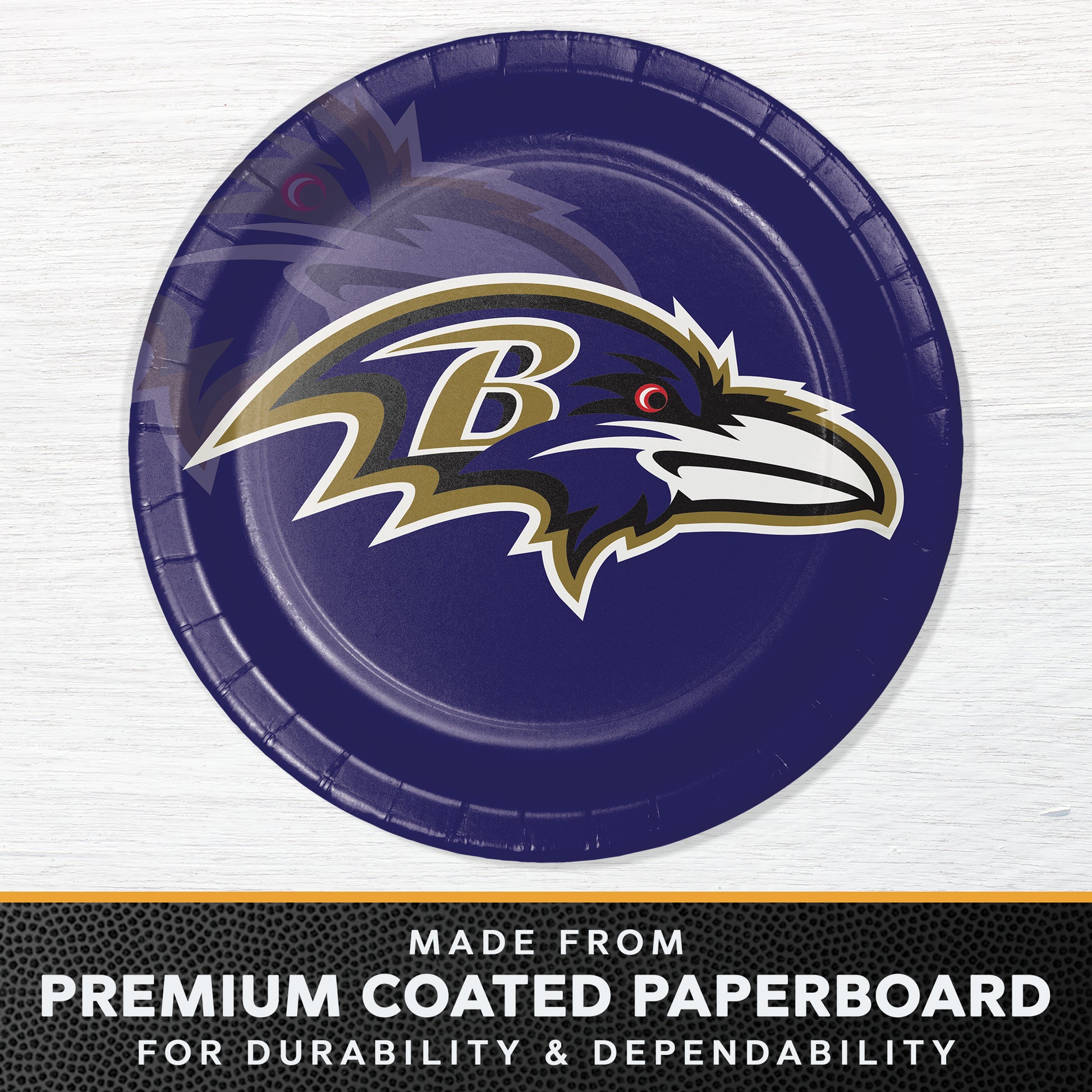 Provide fan's with the ultimate experience, just like being at The Giant Crabcake! Designed with the team colors and logo, these bulk Baltimore Ravens Dinner Plates will provide an authentic feel to any game day party, tailgating event, sports venue, or retail shelf. The purple heavy duty paperboard plates feature an officially licensed pattern including the recognizable raven head logo in the center in gold, purple, white, and black with a larger transparent version in the background. The plates are ideal for larger menu items like pizza, sandwiches, sides, and more. Dinner plates measure 8.75" in diameter and are packaged in quantities of 8 with 12 packages per case.