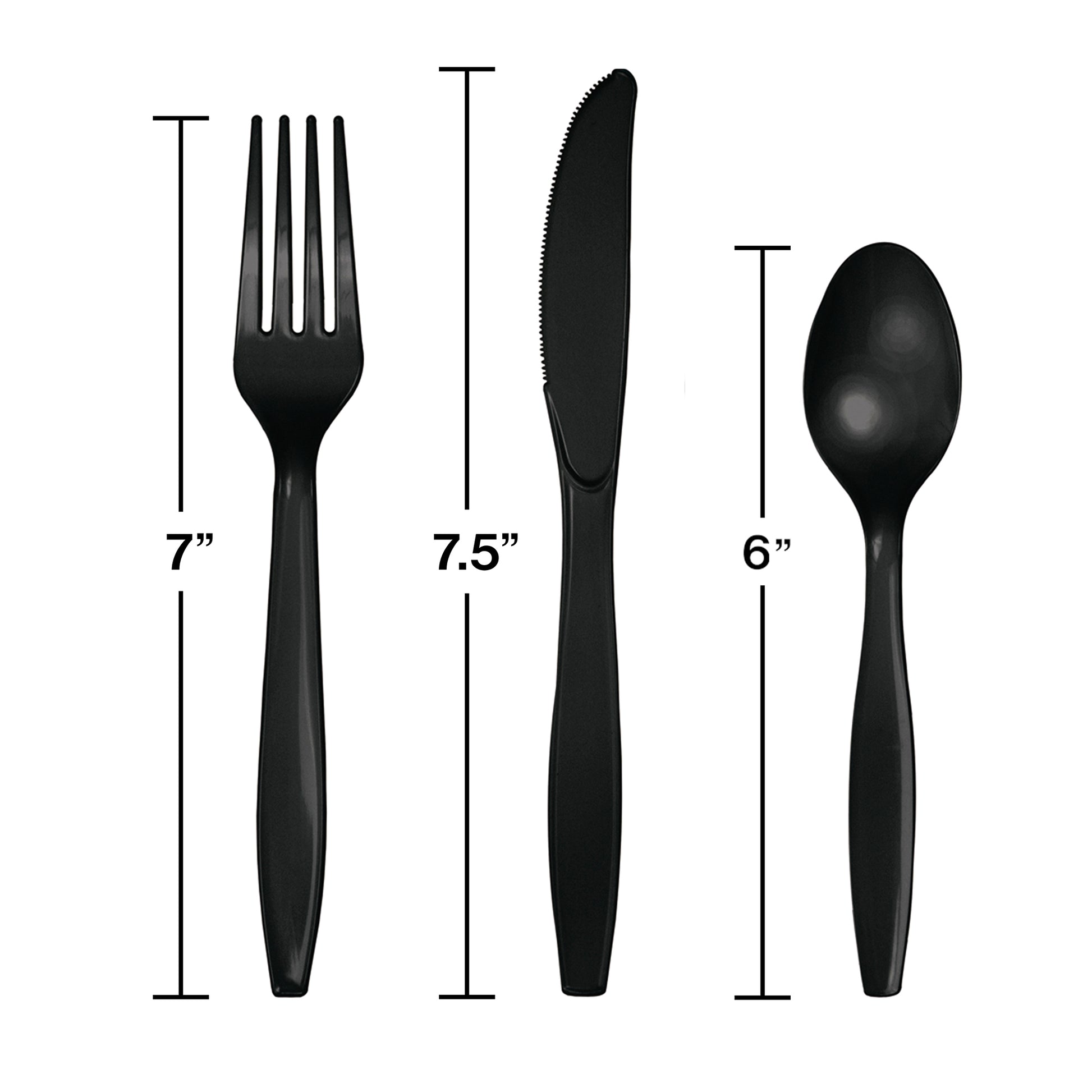 The Black Velvet Assorted Disposable Cutlery from our Touch of Color collection is an economical and stylish choice for a substitution to the real thing. Constructed from premium plastic in a midnight black shade that coordinates with all the Black Velvet colored party supplies, the assorted cutlery set comes with 8 each of spoon, fork and knife for individual table settings. Perfect for use at elegant style weddings, sophisticated corporate functions, casual family gatherings, or any special occasion that will have a large crowd in attendance. The 288 count Black Velvet colored assorted plastic cutlery retails 24 pieces per package and is sold 12 packages per case.