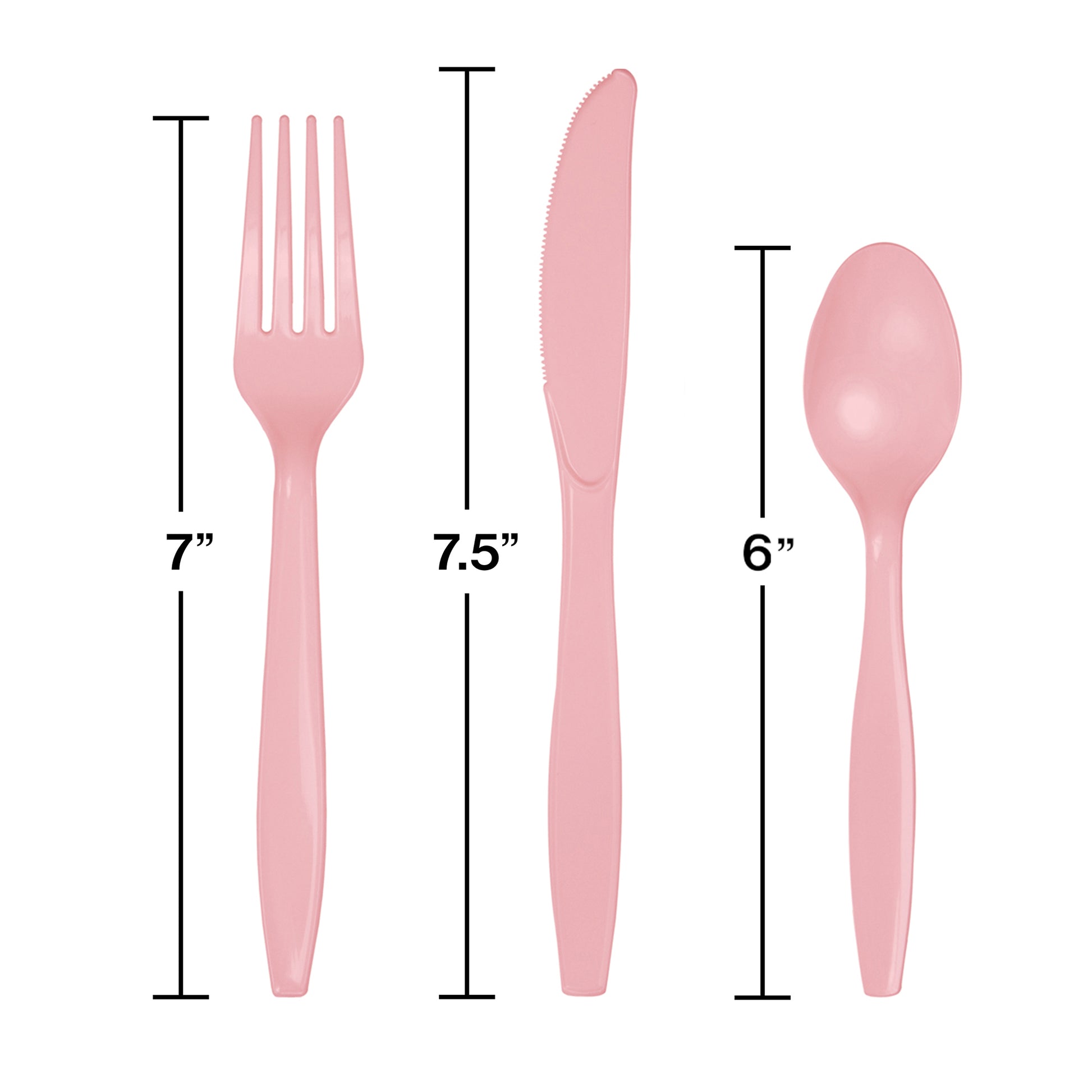 Included in each Classic Pink Assorted Disposable Cutlery set are 8 forks, 8 spoons, and 8 knives, for a total of 24 pieces. The cutlery is constructed of premium plastic, so the utensils are durable, strong and are a nice alternative to using silverware. The classic pink color coordinates with a variety of table ensembles. The 24 piece set comes in retail friendly packaging. One case contains 12 packages.