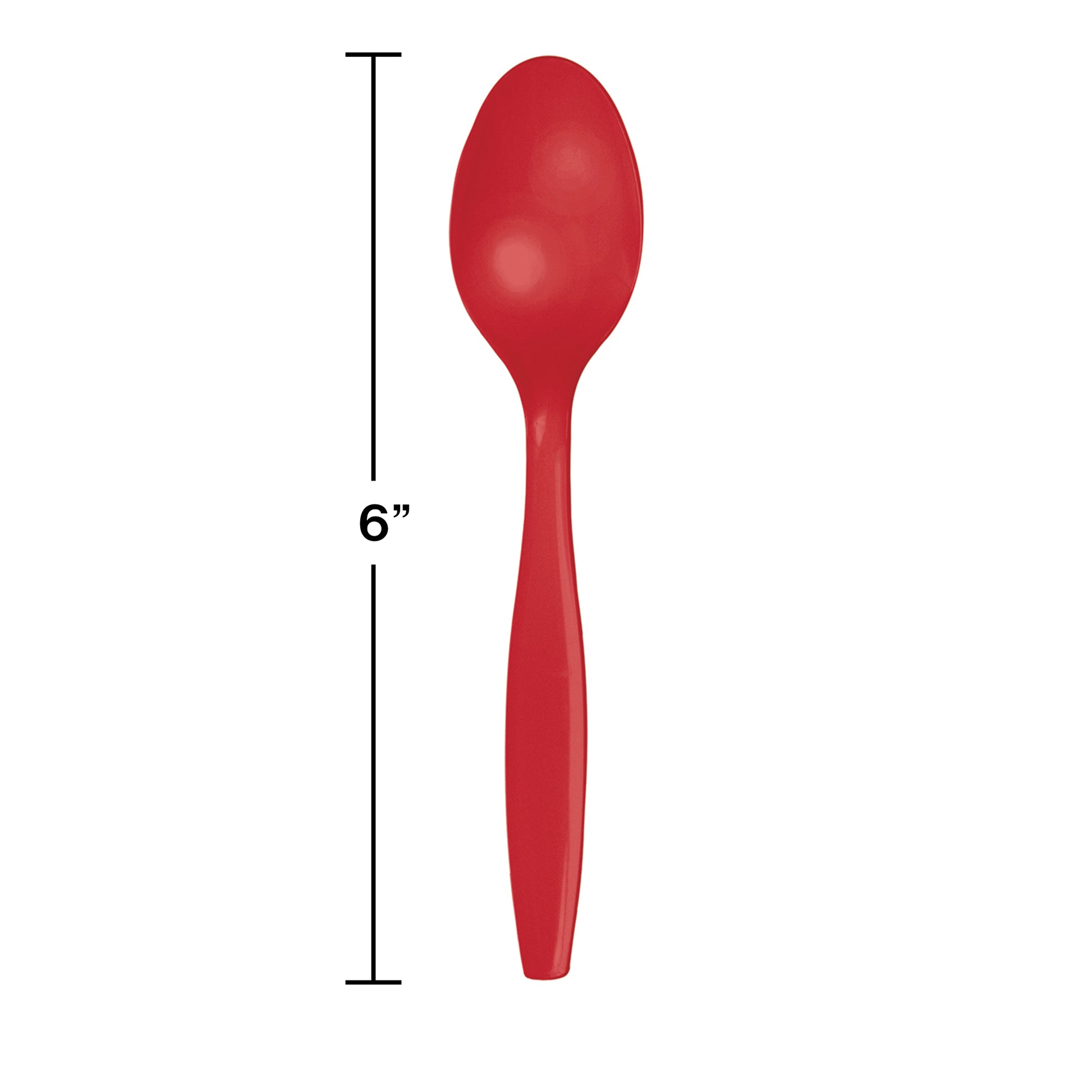 Make any buffet or dining table extra enchanting with our wholesale Classic Red Plastic Spoons and other coordinating red plastic cutlery. These classic red spoons are ideal for large celebrations, corporate events, social gathering and more. Event planners and party hosts alike will appreciate how these heavy duty spoons last through entire meal services without worry over breakage. These stylish classic red spoons are disposable for effortless clean-up after use. Our Classic Red Plastic Spoons are sold in bulk quantities at competitive wholesale cutlery prices. They coordinate beautifully with our entire line of classic red cutlery and matching partyware.