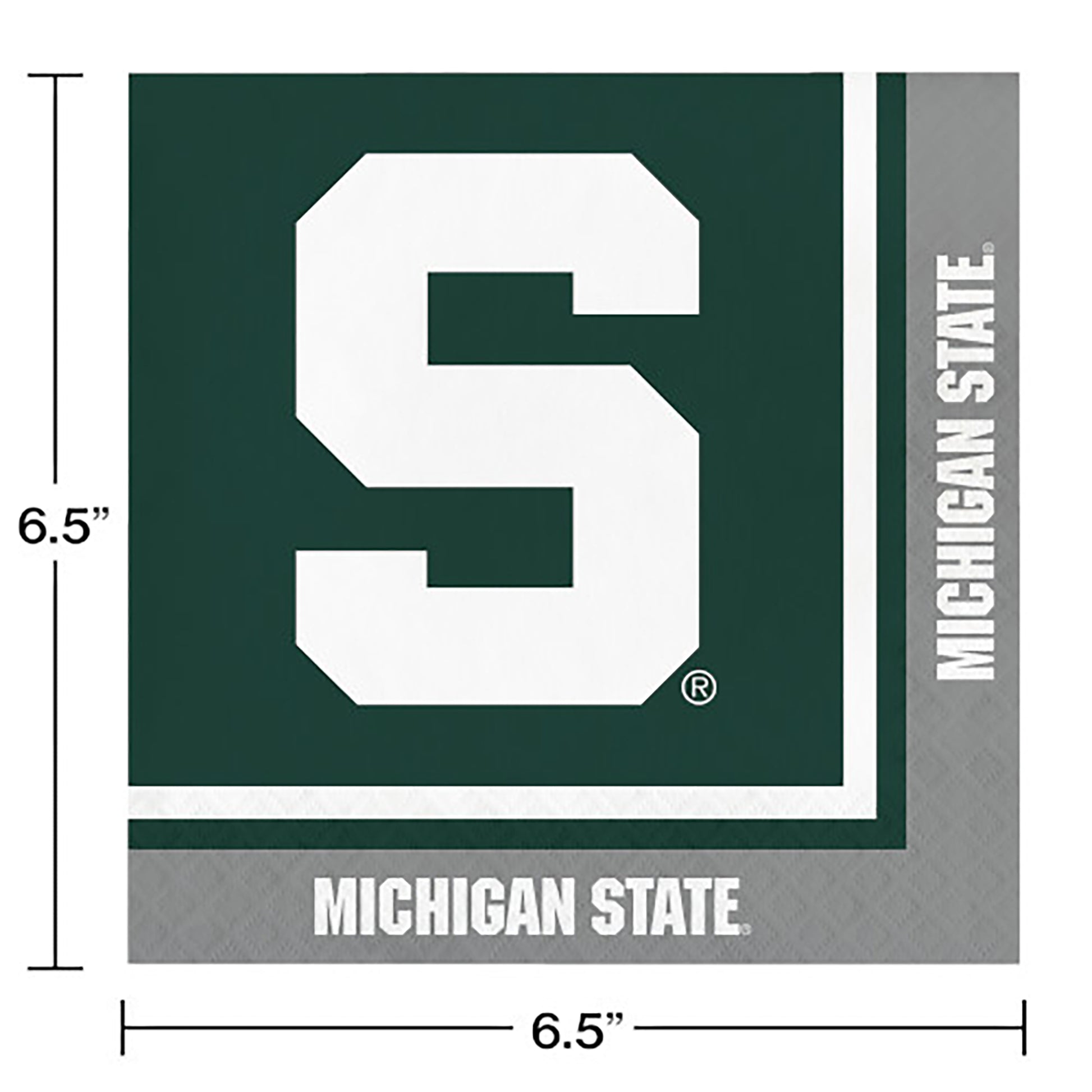 Show your team spirit when you serve your patrons using Michigan party supplies. Michigan State Luncheon Napkins 2 Ply measure 6.375" x 6.375" when folded and are printed in the school colors of green and white. A green border runs along the edge of the napkin with the words Michigan State" in white lettering. A white band runs between the border and the center of the napkin which is green with a large S" logo. Each package contains 20 napkins, each case contains 12 packages. For personal use only, not intended for commercial use.