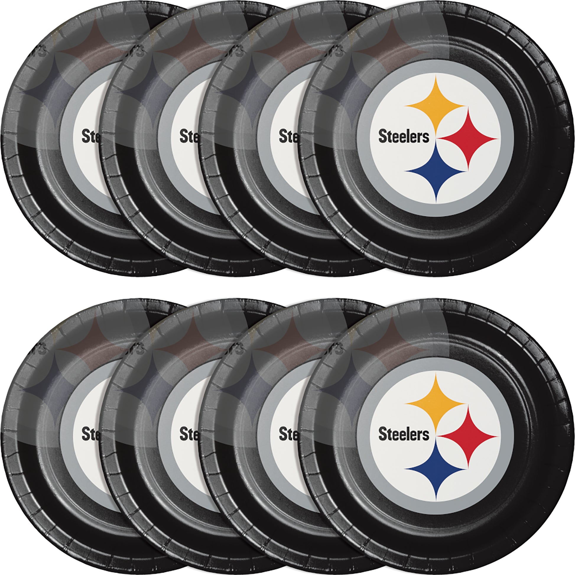 Serve delicious meals on licensed NFL party supplies guaranteed to inspire team support. The Pittsburgh Steelers Dinner Plates are constructed of heavyweight paperboard stock that is perfect for holding hot servings of burgers, sausages, pizza, or sandwiches. The round dinner plates have a black background that features the Steelers logo in the center. The white circle is bordered by silver and printed with the name “Steelers" next to the yellow, red, and blue curved stars of the team. The upper left of the plates is printed with a shadow image of the same emblem. Retailers, businesses, and event planners will score winning points with patrons and guests when these plates are combined with other products from the theme along with solid colored tableware and accessories for a winning scene. Dinner plates measure 8.75 inches in diameter and are sold 8 per package with 12 packages per case.