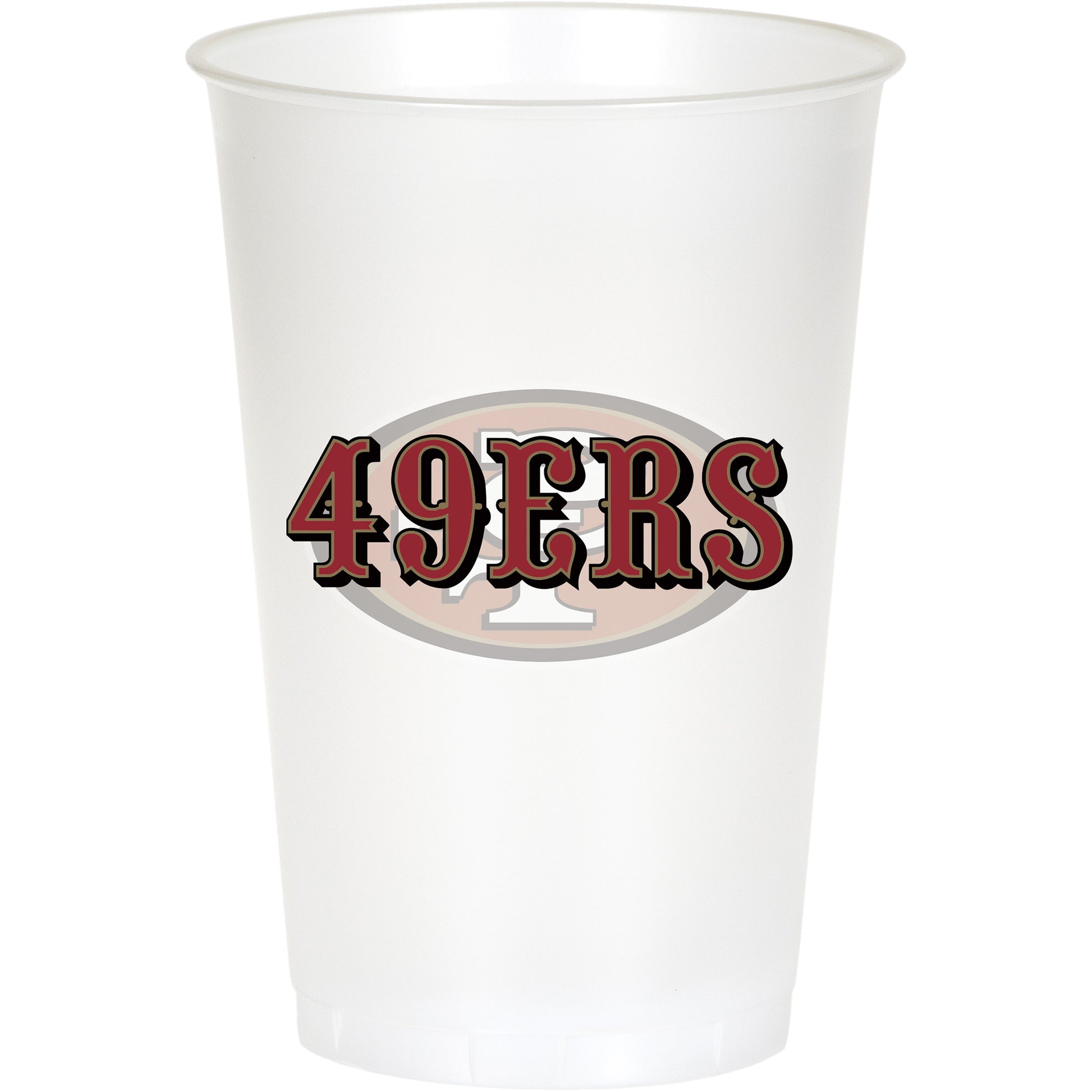 Keep thirsty fans happy and hydrated with licensed NFL party supplies that support their favorite teams. The San Francisco 49ers 20 oz Plastic Cups are fashioned with a tapered shape and curled rim for easy handling and sipping. One side of the transparent cups is printed with the 49ers logo, the red oval stamped with the white letters "SF" and outlined in gold and black. The opposite side is stamped with "49ers" in gold lettering. Plastic cups can be filled with icy cold beverages such as soda, lemonade, water, or alcoholic beverages. The disposable cups are also handy for holding snacks served to fans at sports bars, restaurants, food vendors and more. Combine with matching tableware from the 49ers ensemble or with solid colored accessories for a spirited display. Plastic cups are #6 recyclable and sold 8 per package with 12 retail-ready packages per case.