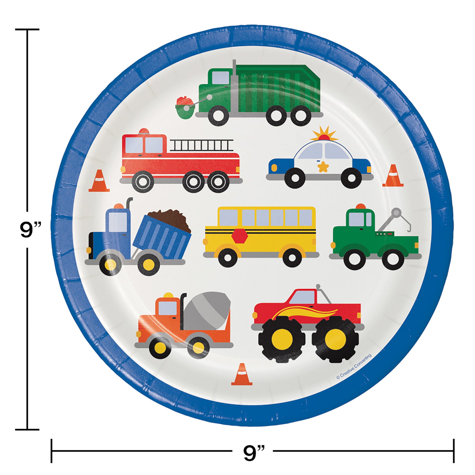 Colorful themed party supplies add an element of fun to events. Traffic Jam Dinner Plates feature brightly colored vehicles including a fire truck and tow truck and coordinate with the Traffic Jam theme. The round plates have a blue border and are sturdy and leak-proof. Disposable paper plates are sized for use when serving entrees or snack foods. Sold in bulk packaging of 96 count, plates can be used for banquet centers, schools, and children's party locations. Dinner plates measure 8.75" and are packaged in quantities of 8 each with 12 packages per case.