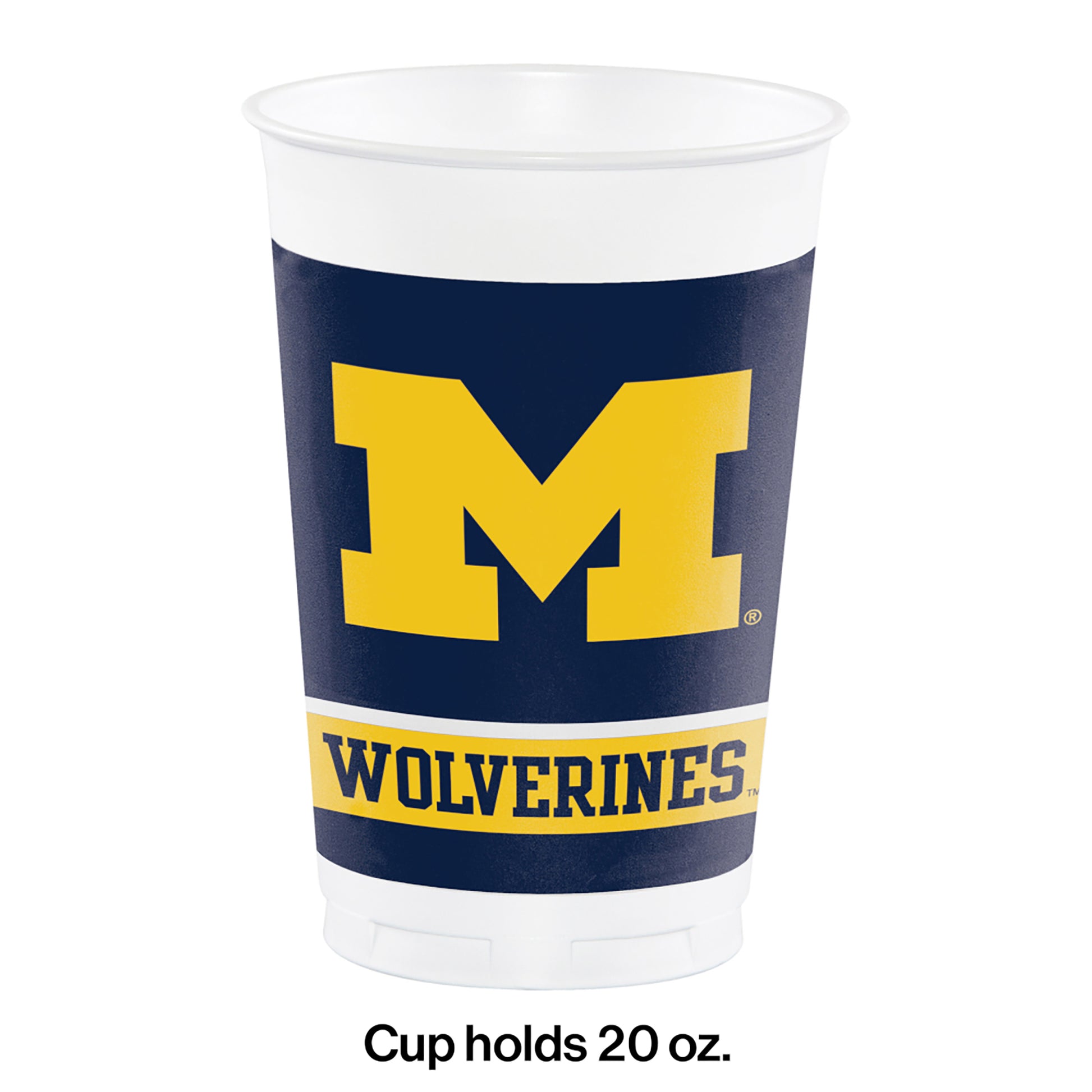 Wolverines can toast a victory at your indoor or outdoor event with University of Michigan Plastic 20 Ounce Cups. Plastic cups are white and hold 20 ounces of a cold beverage. A blue band runs along the bottom of the cup with a yellow band above and the word “Wolverines" in blue print. The middle of the cup sports a blue band with a large yellow "M" in yellow. The University of Michigan school colors provide a festive atmosphere at your outdoor patio space or tailgating event. Each package contains 8 cups, each case contains 12 packages. For personal use only, not intended for commercial use.
