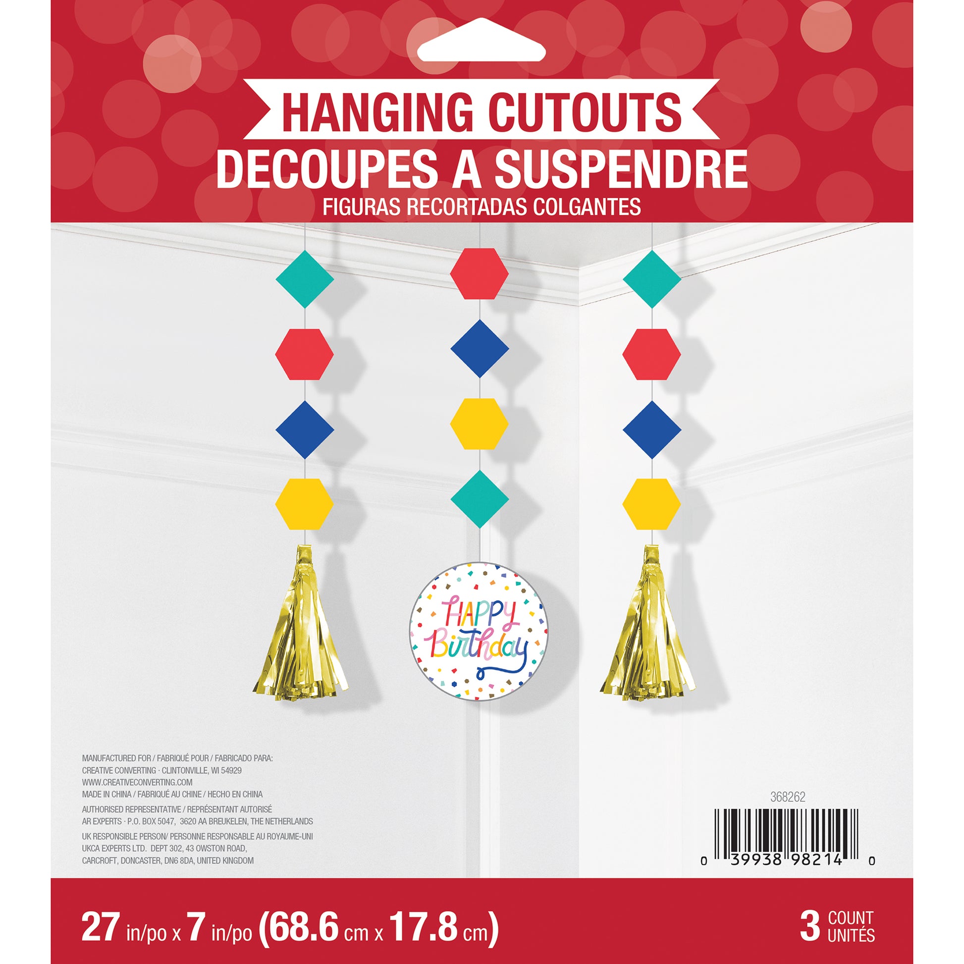 Let that special someone know that youre excited to celebrate their birthday when you decorate the room with the Birthday Confetti Hanging Cutouts. These paper cutouts feature various shapes with gold tassels and the words Happy Birthday with a gold and bright rainbow theme. The hanging decorations measure 7 x 27 and are sold in packs of 36. These hanging cutouts coordinate with all Birthday Confetti party supplies. Your birthday celebration will be a success with help from our Birthday Confetti Party Supplies. With wholesale pricing and bulk quantities, our Birthday Confetti Hanging Cutouts are perfect for event planners, caterers, and home hostesses alike.