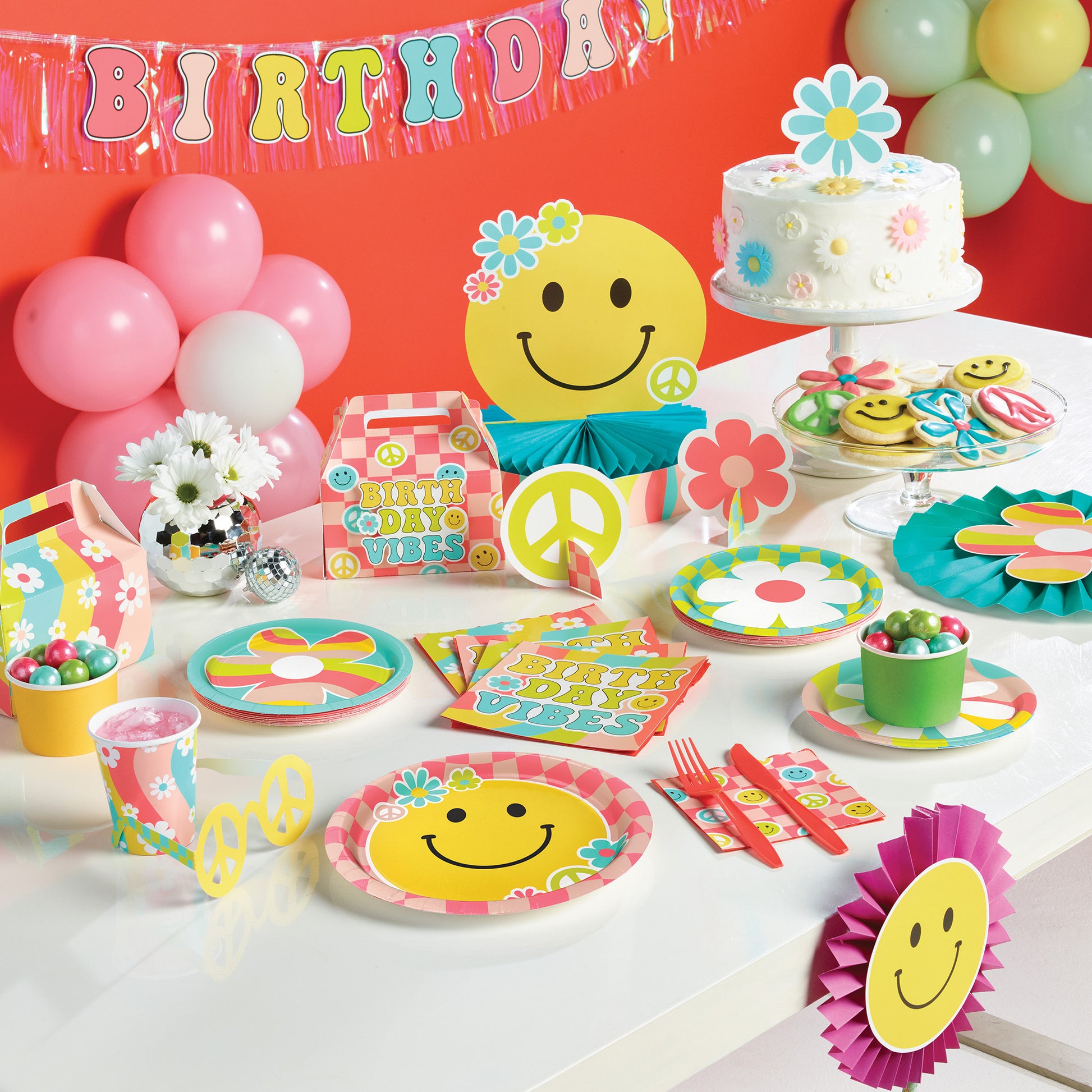 Bring your party vision to life with this unique Flower Power Centerpiece. The cheerful centerpiece features bright yellow smiley face on blue honeycomb. Blue, pink, and lime green peace sign and flower design cutouts are included to decorate your party table. The centerpiece can be used on any surface or in the middle of the table to add a pop of color and make your guests smile. Sold in cases of 6 packs, each pack has 1 individual centerpiece. Coordinates with other Flower Power party supplies. With wholesale pricing and bulk quantities, our Flower Power Centerpieces are perfect for event planners, caterers, and home hostesses alike.