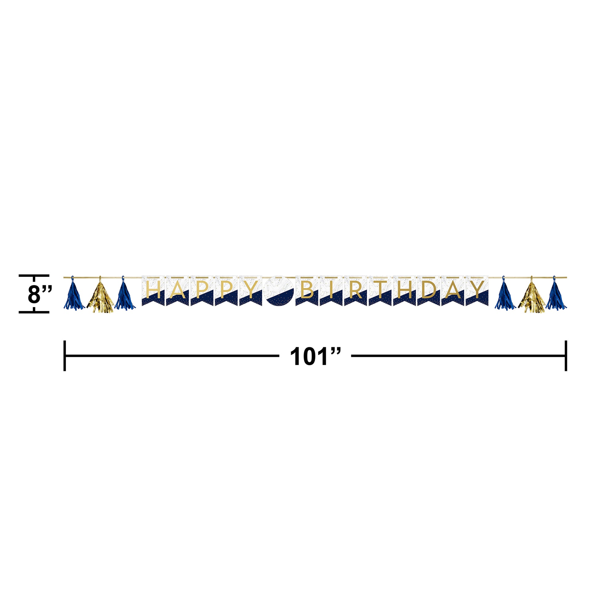 Welcome the guest of honor in style when you decorate the party with the Navy and Gold Birthday Banner. The paper banner measures 8" x 101 and features confetti dots and the words "Happy Birthday!" with a gold, navy, and white theme. Sold in packs of 12, the paper banner coordinates with all Gold and Navy party supplies. With wholesale pricing and bulk quantities, our Navy and Gold Birthday Banners 12 ct are perfect for event planners, caterers, and home hostesses alike.