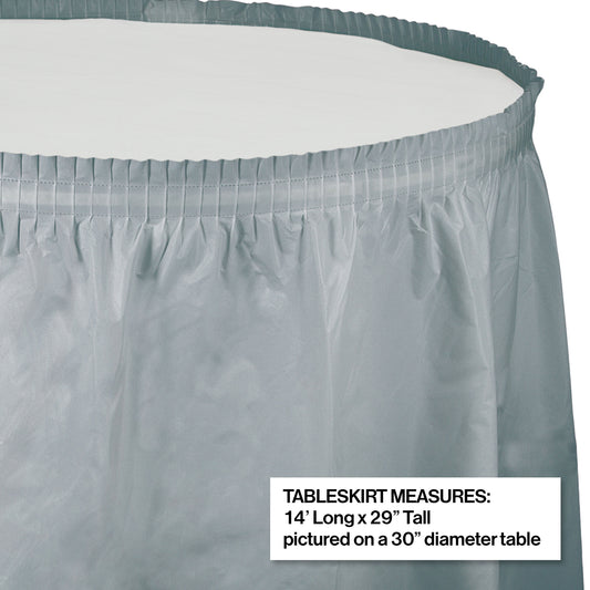 Need to hide event supplies or create a classy backdrop? The disposable plastic table skirts are a wonderful product that is great to use on buffet serving tables, check-in stations for conferences or on temporary stages. The material is easy to wipe clean and the decorative pleated top edge is easy to adhere to table edges to keep the skirt in place. The plastic table skirts create a curtain and supplies can easily be hidden underneath the table.