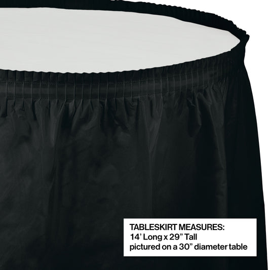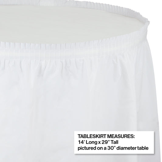 Need to hide event supplies or create a classy backdrop? The disposable plastic table skirts are a wonderful product that is great to use on buffet serving tables, check-in stations for conferences or on temporary stages. The material is easy to wipe clean and the decorative pleated top edge is easy to adhere to table edges to keep the skirt in place. The plastic table skirts create a curtain and supplies can easily be hidden underneath the table.