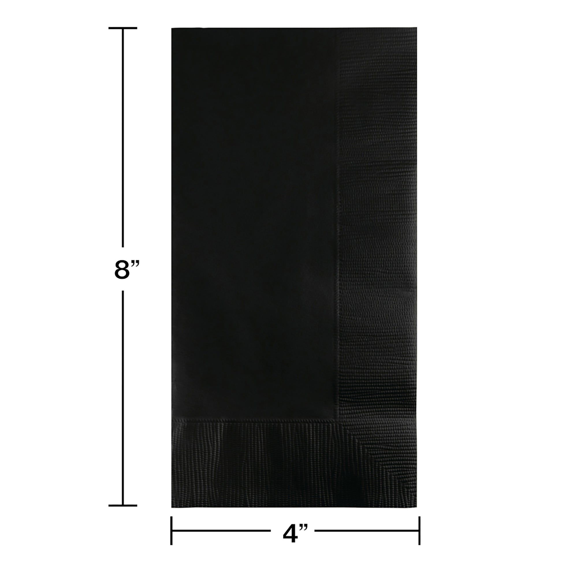 The Black Velvet Dinner Napkins from our Touch of Color collection features an unsurpassed color match consistency on every high quality package produced. The midnight black 2-ply dinner napkin folded measures 4 inches x 8 inches and comes accented with an embossed coin edge pattern on two of the napkin edges for an elegant and classy look at any festivity. The high count napkin package makes it perfect for hosting larger events. Black Velvet Dinner Napkins retail 50 napkins per package and are sold 12 packages per case.