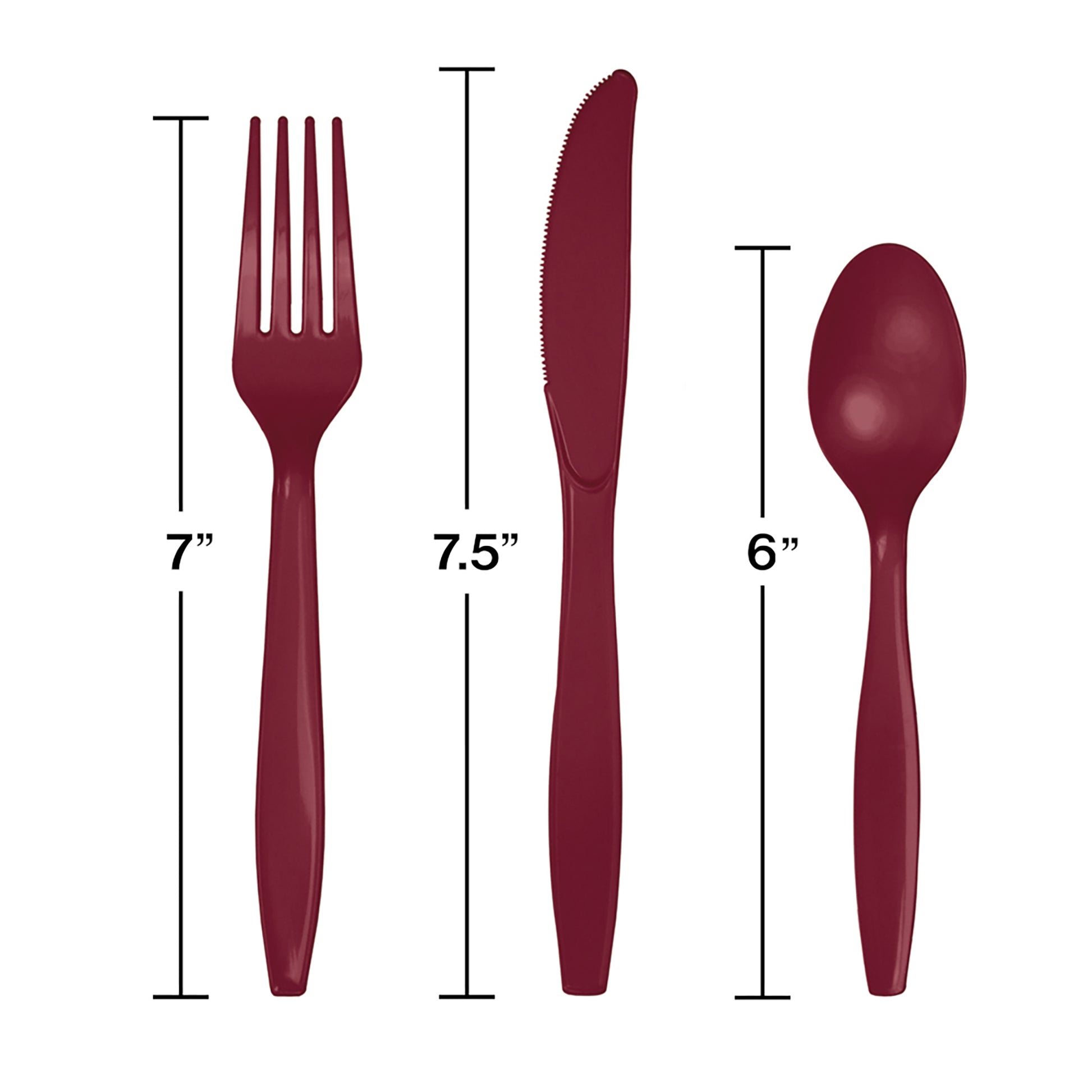 The Burgundy Assorted Disposable Cutlery from our Touch of Color collection is a practical and budget friendly substitution to stainless flatware at any event that will host a large crowd in attendance. Constructed from premium plastic in a classy red wine hue to coordinate with all the burgundy solid color party supplies, the assorted cutlery set comes with one spoon, fork and knife for each of 8 place settings in every 24 piece retail pack. The 288 count Burgundy colored assorted plastic cutlery retails 24 pieces per package and is sold 12 packages per case.