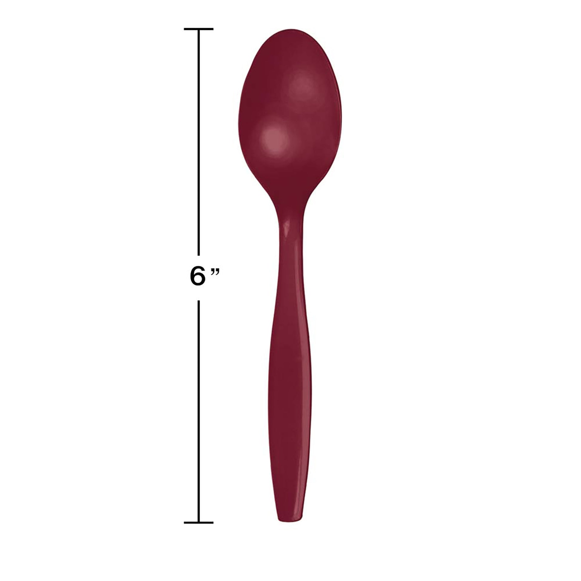 Make your next catered event, social gathering, or any other large celebration a big success with our wholesale Burgundy Plastic Spoons. These vibrant burgundy spoons will add a beautiful touch of color to any buffet or table setting. In addition to their beautiful design, guests and patrons alike will appreciate the exceptional quality of these disposable spoons. Our plastic silverware is constructed from premium plastic, so it will last through an entire meal service without worry over breakage. Use our burgundy red spoons with our entire set of burgundy cutlery, or mix our burgundy plastic cutlery with utensils in other shades for an extra vibrant look.