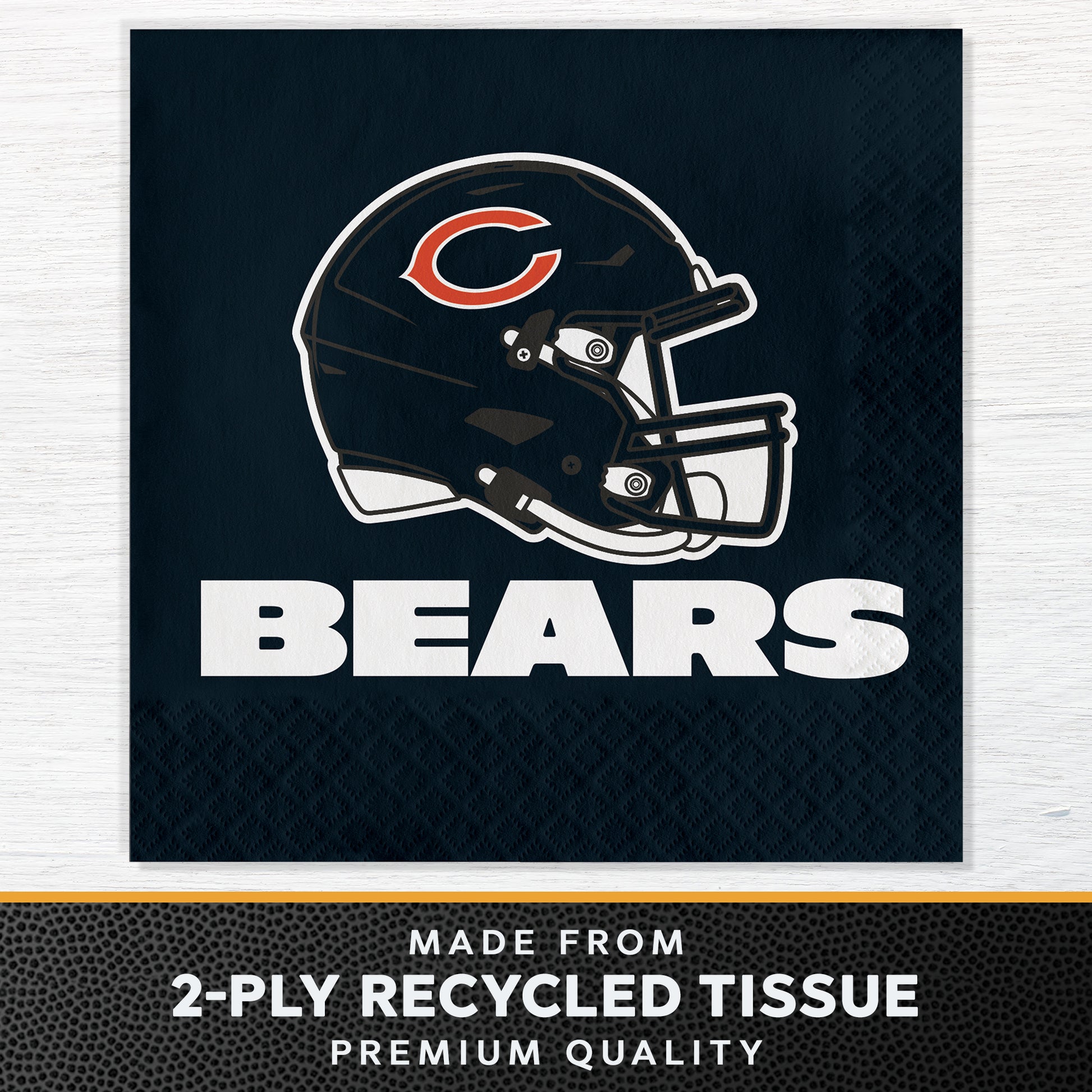 Bear down and supply your bar, retail store, or next team party with these tableware offerings for the ultimate fan experience! The wholesale Chicago Bears Lunch Napkins celebrate your favorite NFC North football team with a simple design celebrating their colors and logo. The officially licensed deep blue 2-ply paper napkins feature an image of the Bears helmet in the center and the team name printed underneath in white. Accompany any larger menu items or buffet lines with these durable luncheon napkins for a fun addition any fan is sure to roar over. The quarter-fold lunch napkins measure 6.375" square and are packaged in quantities of 16 with 12 packages per case.