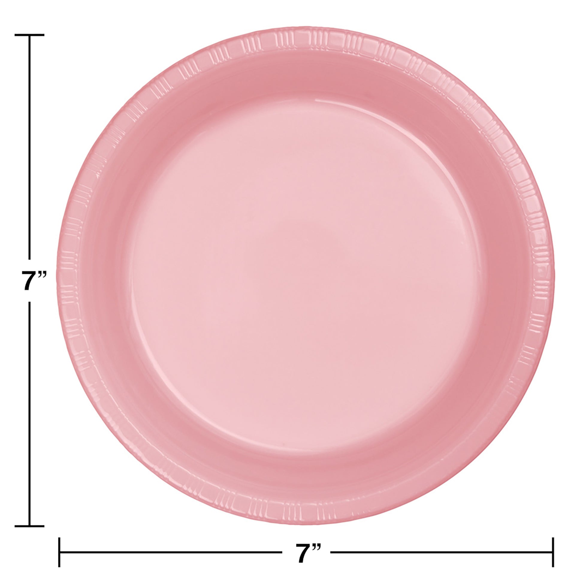 The Classic Pink Plastic Plates measure 7" in diameter and are constructed of durable plastic to support the weight of heavier food. Use the plates for snacks and appetizers, as well as for desserts. The elevated rim of the plate features an embossed pattern around the outside edge for classic styling. The plastic is recycling symbol #6. Part of the Touch of Color brand in our solid color party supplies selection, the plates arrive 20 per package in retail ready packaging; sold in quantities of 12 packages per case.