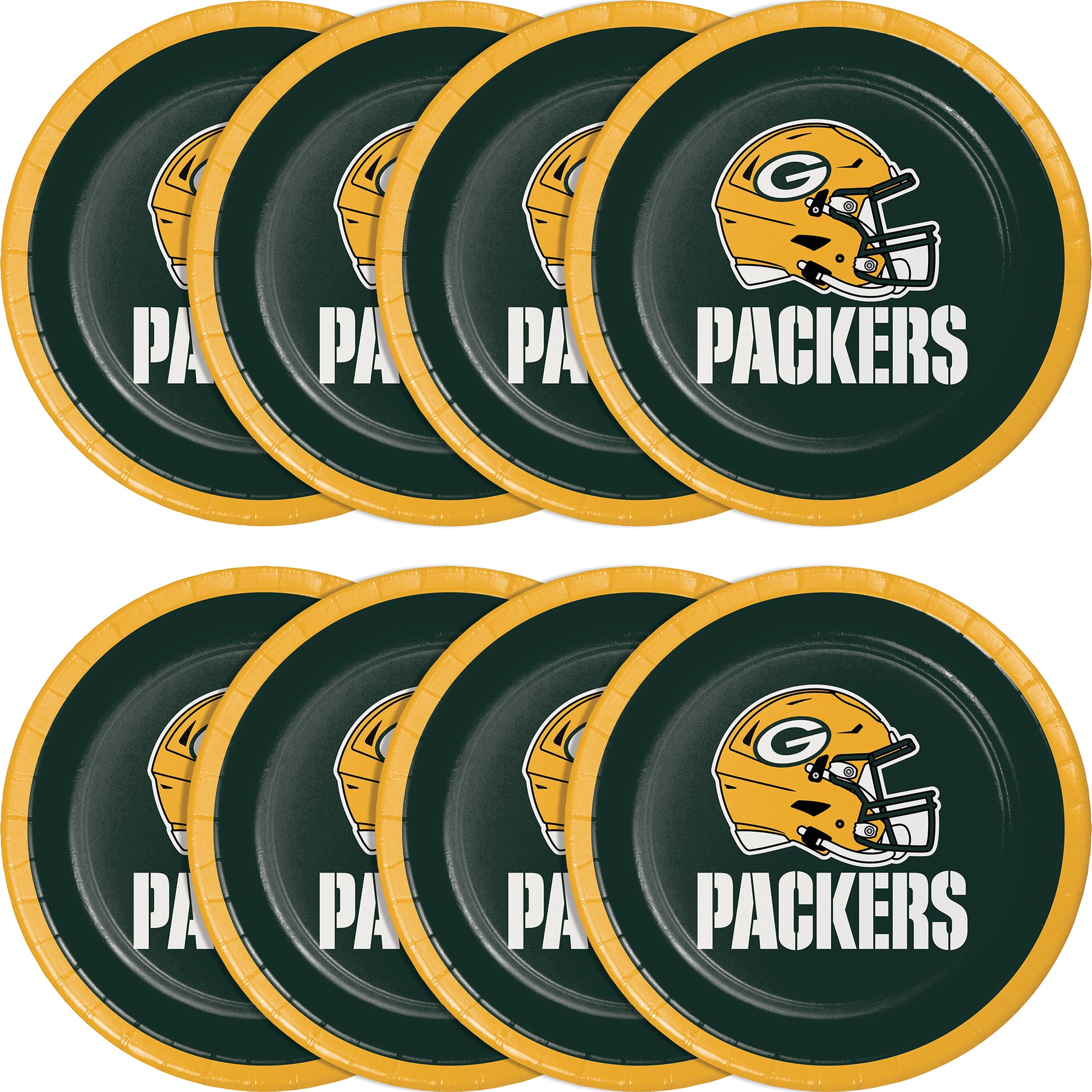 At indoor and outdoor venues, present desserts and appetizers on officially licensed NFL tableware. Green Bay Packers Dessert Plates are constructed from heavyweight paperboard stock and have a green background with the team helmet and the word “Packers" in white lettering. The paper plates feature a gold rim and are sized for use with snacks and sweets at bars, restaurants, and tailgating events. Coordinating easily with other Packers party supplies, the plates measure 6.875 inches in diameter and are sold 8 per package with 12 packages per case.