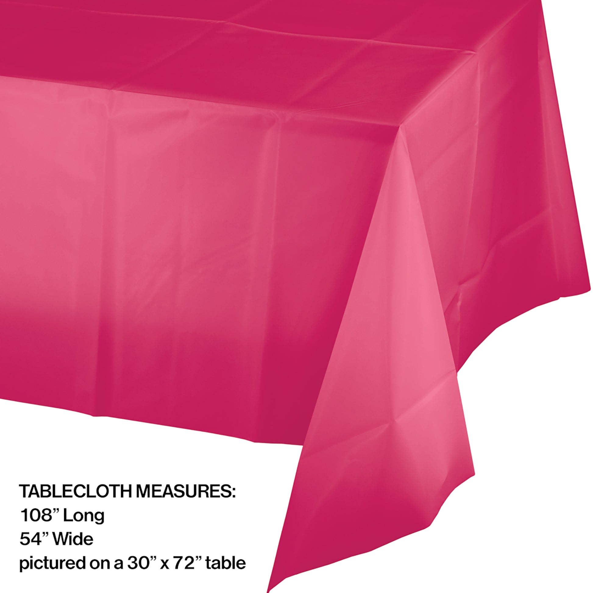 Drape the tables in classy style and brilliant color at any catered event, trade show or special gathering with the Hot Magenta Plastic Tablecloths. Each durable rectangular plastic tablecloth measures 54 inches x 108 inches and will fit standard rectangular tables. The plastic surface protects tabletops from spills and scratches and can be wiped clean during the event and then thrown out when the celebration is over. The bright pink color is a great accent for multiple printed theme ensemble products used for showers, birthdays or receptions. The Hot Magenta Plastic Tablecloth is sold with 12 tablecloths per case.