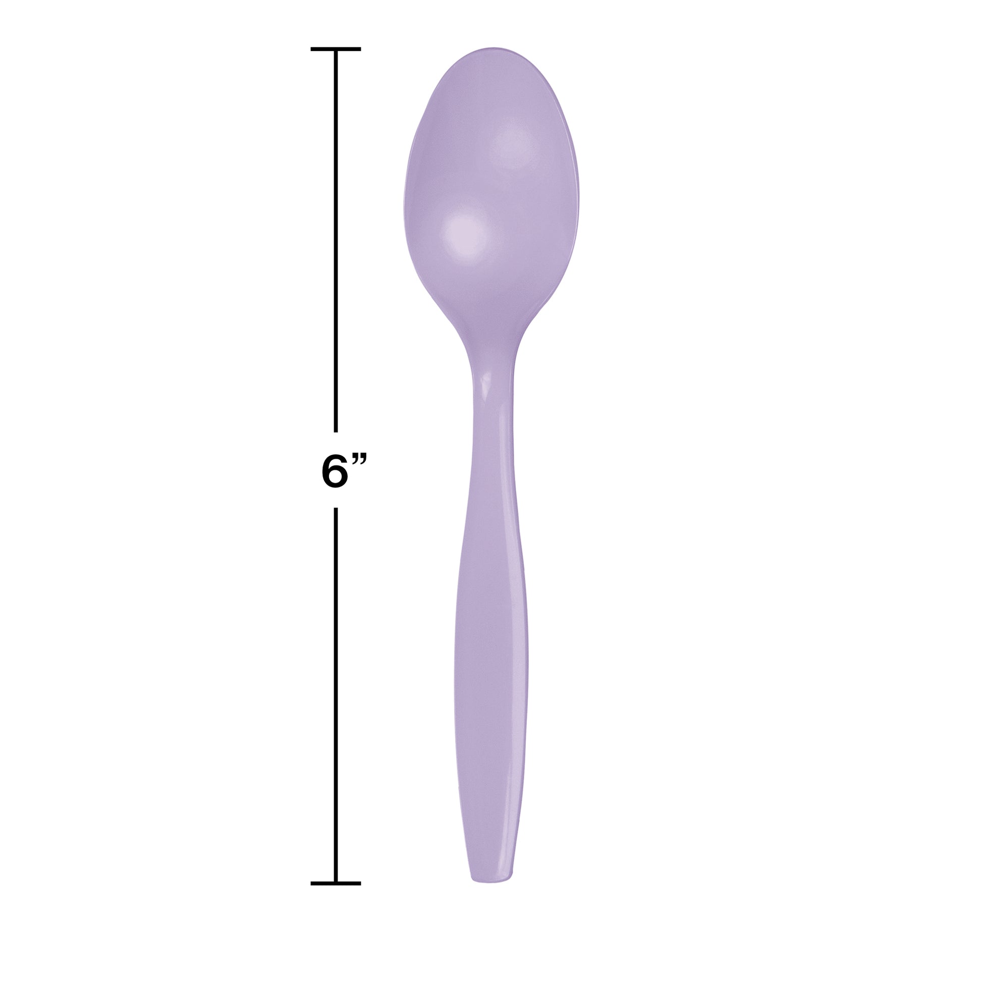 Our Luscious Lavender Plastic Spoons and complementary lavender cutlery will bring a combination of eye-pleasing color and exceptional quality to any buffet or dining table. These wholesale plastic spoons coordinate perfectly with purple and pink themed table settings. Additionally, our wholesale disposable spoons are durable enough to last through an entire meal service without incident. These light purple spoons offer fast clean-up, too; they can easily be thrown away or recycled after events. Our heavy duty plastic spoons coordinate beautifully with our other Luscious Lavender plastic cutlery and partyware.