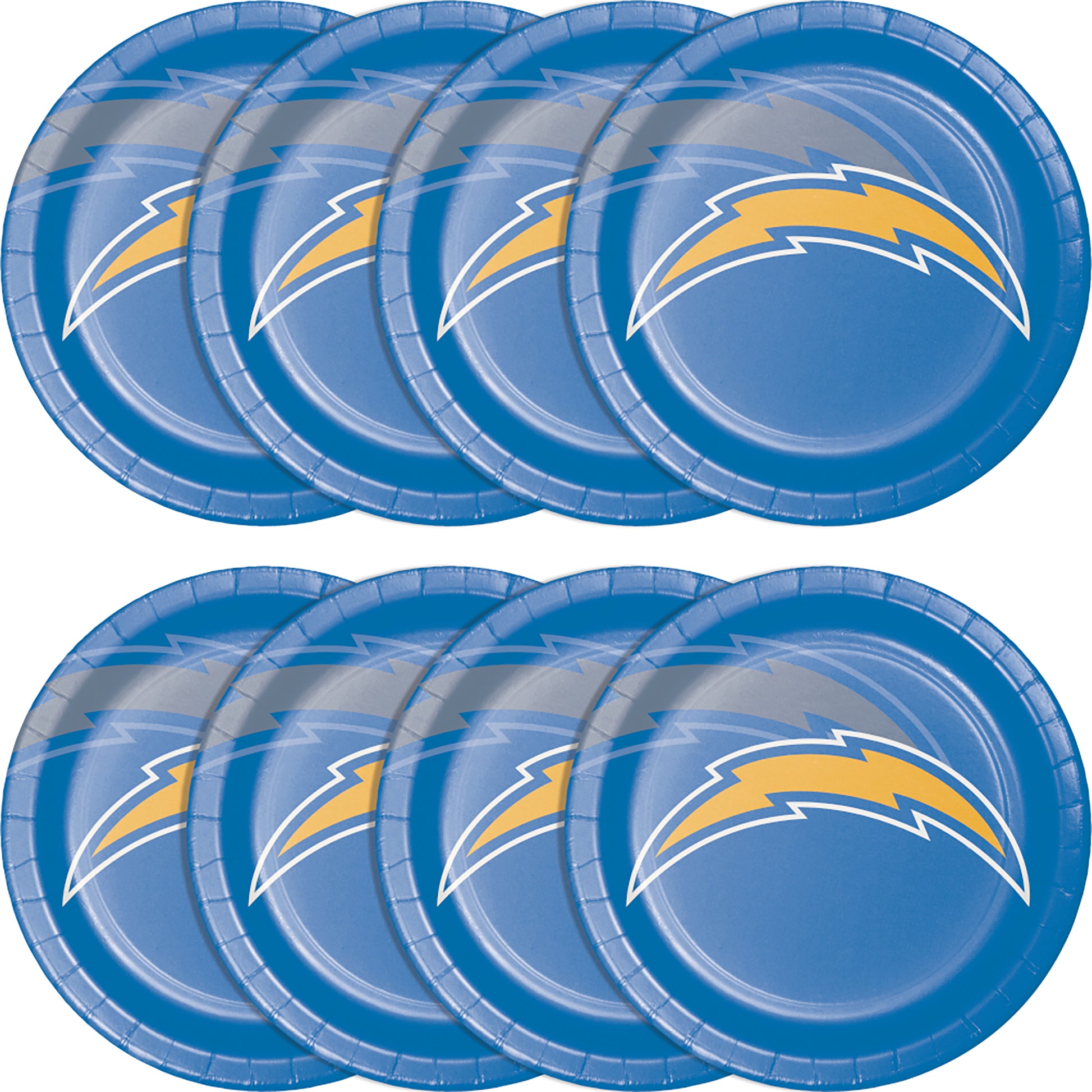 Serve delicious meals on licensed NFL party supplies guaranteed to inspire team support. The Los Angeles Chargers Dinner Plates are constructed of heavyweight paperboard stock that features a bold navy blue background printed with a brilliant, curved gold lightning bolt outlined in blue and white that looks like it explodes off the dish. The upper left background contains a shadow image of the bolt giving the picture added energy. These larger paper plates are perfect for dishing up heartier meals such as burgers and fries, pizza, or a tasty deli sandwich at concession stands, restaurants, sports bars and more. The disposable dinner plates are decorated in true team spirit and coordinate perfectly with other Chargers party supplies as well as solid color tableware and accessories to energize fans. Dinner plates measure 9 inches in diameter and are sold 8 per package with 12 packages per case.