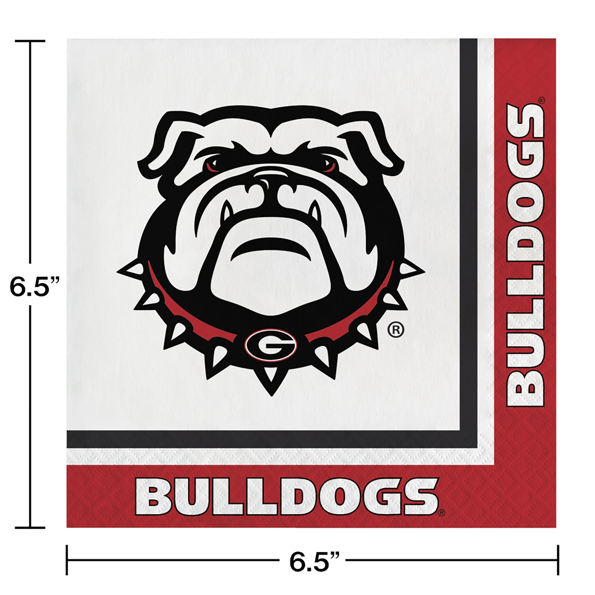 The Georgia Bulldogs have center stage on the University of Georgia Luncheon Napkins for use at large events or in a bar or restaurant setting. Napkins are printed with the colors of red, white, and black and are 2 ply. Measuring 6.375" x 6.375" folded, napkins have a white background and a black border along the edge with the word “Bulldogs" in white beneath a black background with an image of the Georgia Bulldog in the center. Each package contains 20 napkins, each case contains 12 cases. For personal use only, not intended for commercial use.