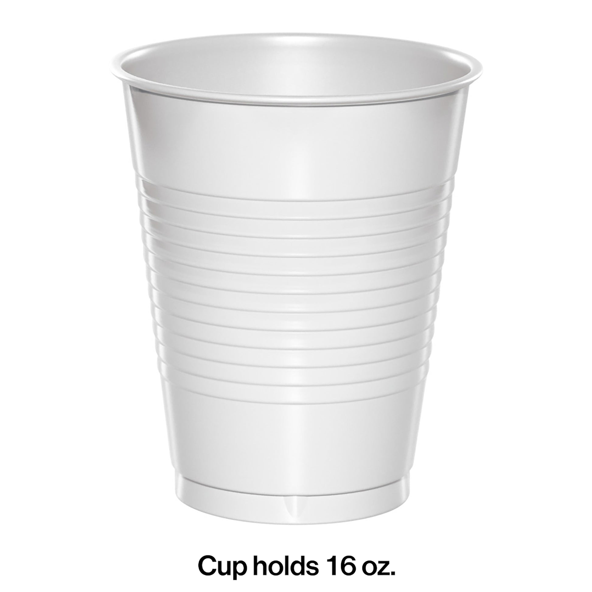 Packaged in value quantities of 20 cups each, the White Plastic Cups are perfect for larger celebrations that might include baby showers, birthdays, bridal showers, or backyard BBQs. The sturdy 16 ounce plastic cup is ideal for frosty beverages or party cocktails where a standard paper cup is not quite enough. As an added bonus, the disposable cups can simply be thrown away or recycled (#6) at the end of the event. The white coordinates nicely with any number of party ensembles or can be mixed and matched with complementary solid color supplies. Not intended for use in the microwave or dishwasher, the White Plastic 16 Ounce Cups include 20 per package with a case quantity of 12 packages.