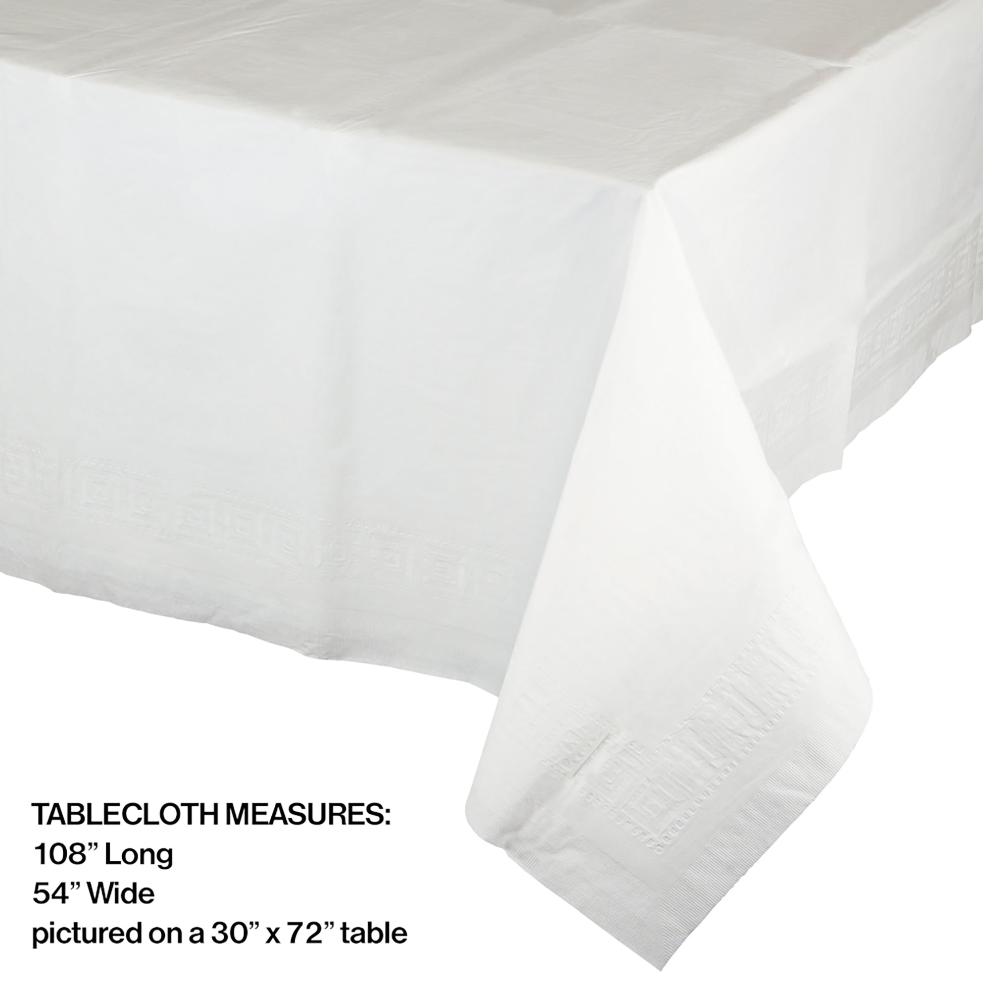 Ensemble party supplies and complementary solid tableware will look polished displayed atop crisp white tablecloths. With no worries over rental fees, damage, or cleaning charges, the paper tablecloths are a great way to add a touch of polish while still remaining budget friendly. The clean white shade makes them coordinate nicely with a variety of party ensembles for baby showers, bridal showers, birthdays and more. The tablecloth is 2 ply with a poly lining and measures 54 inches x 108 inches, perfect for standard size banquet tables. The White Paper Tablecloth is packaged individually with a case quantity of 6 packages.