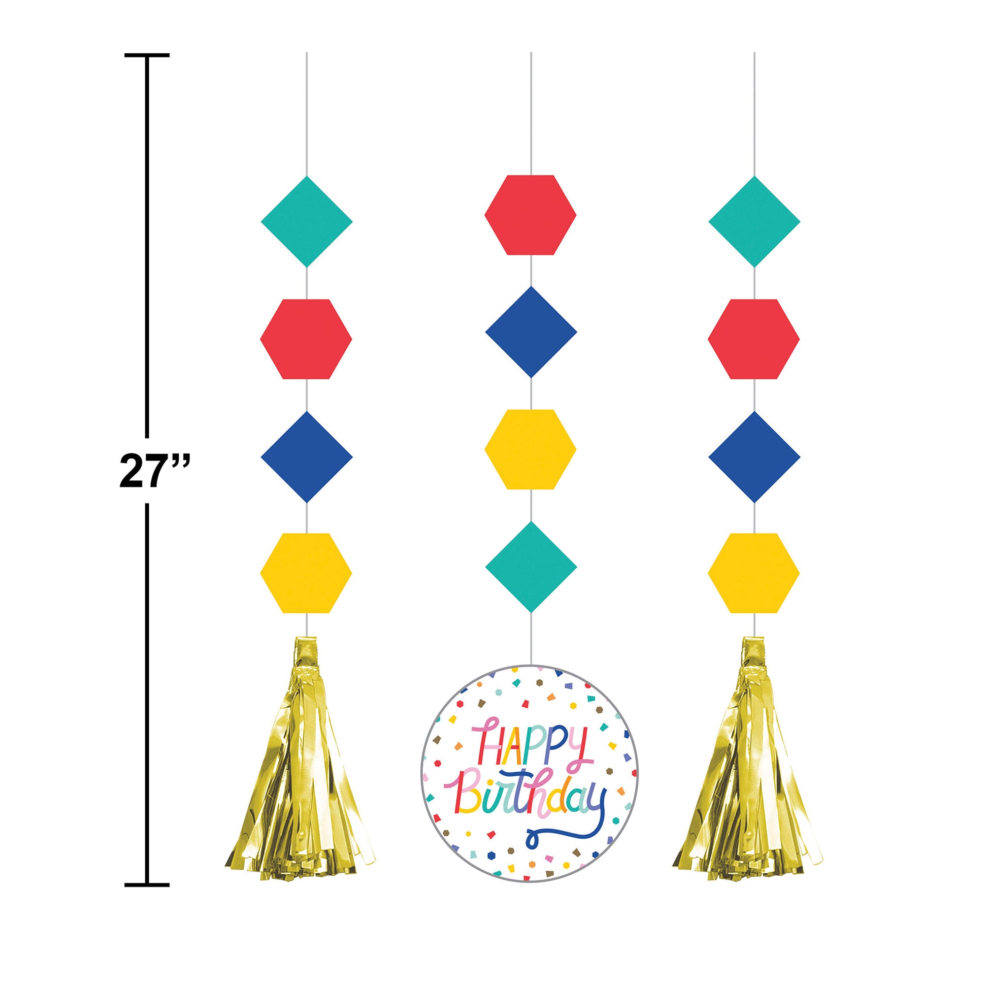 Let that special someone know that youre excited to celebrate their birthday when you decorate the room with the Birthday Confetti Hanging Cutouts. These paper cutouts feature various shapes with gold tassels and the words Happy Birthday with a gold and bright rainbow theme. The hanging decorations measure 7 x 27 and are sold in packs of 36. These hanging cutouts coordinate with all Birthday Confetti party supplies. Your birthday celebration will be a success with help from our Birthday Confetti Party Supplies. With wholesale pricing and bulk quantities, our Birthday Confetti Hanging Cutouts are perfect for event planners, caterers, and home hostesses alike.