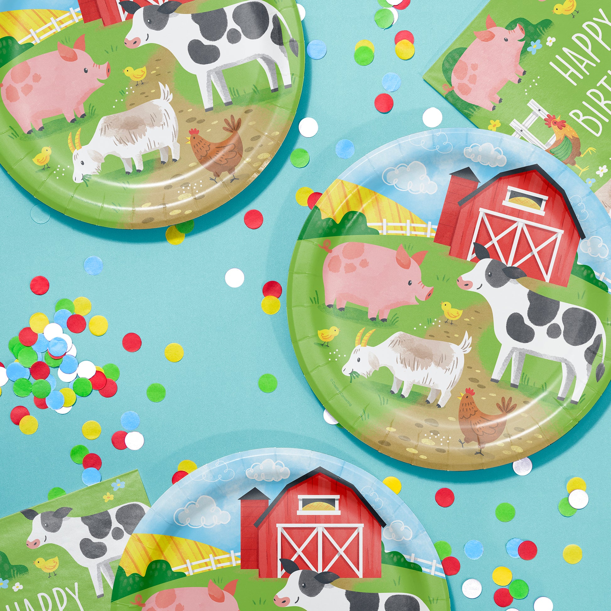 Throw a festive barnyard bash with help from our Farm Animals Paper Plates. The plates measure 9", and they feature a farmyard scene including a barn, cow, pig, goat, and chicken. Use the plates for serving a meal at your party, and complete your celebration with our matching Farm Animals design. Our Farm Animals Paper Plates are sold 96 per package. With wholesale pricing and bulk quantities, our Farm Animals Paper Plates are perfect for event planners, caterers, and home hostesses alike.