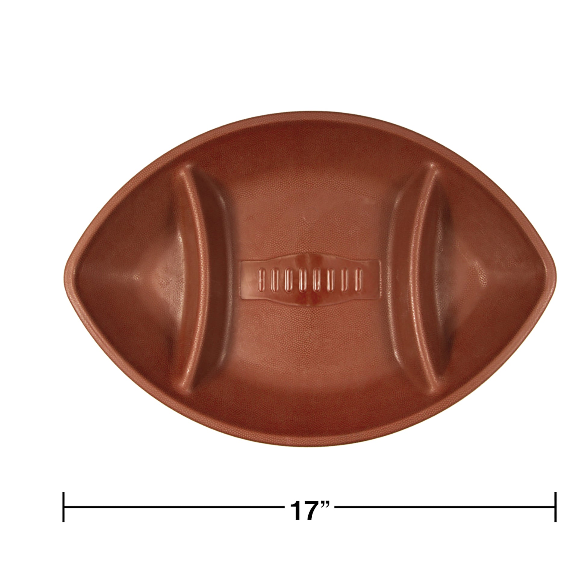 Feed your hungry football fans with this fun Football Chip and Dip Tray. Perfect for any half-time snacks such as chips and dip, tortillas and salsa or veggies and veggie dip. Features a large brown football shaped tray with separate compartments Disposable but sturdy enough to hand wash for use after use. With wholesale pricing and bulk quantities, our Football Chip and Dip Trays 6 ct are perfect for event planners, caterers, and home hostesses alike.